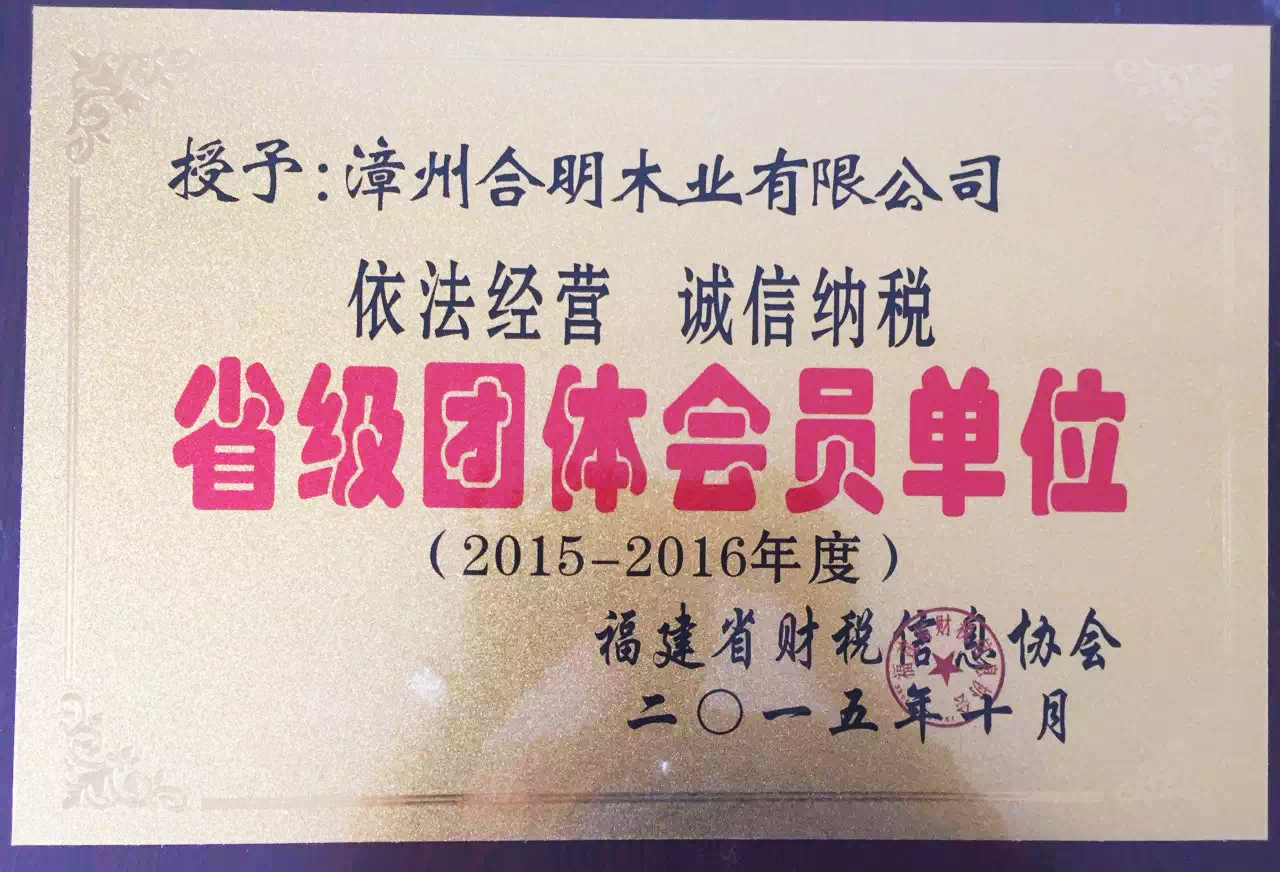 2015年10月,合明木業(yè)榮獲福建省2015-2016年度“依法經(jīng)營(yíng)、誠(chéng)信納稅”省級(jí)團(tuán)體會(huì)員單位,該獎(jiǎng)項(xiàng)是由福建省財(cái)稅信息協(xié)會(huì)頒發(fā)。
