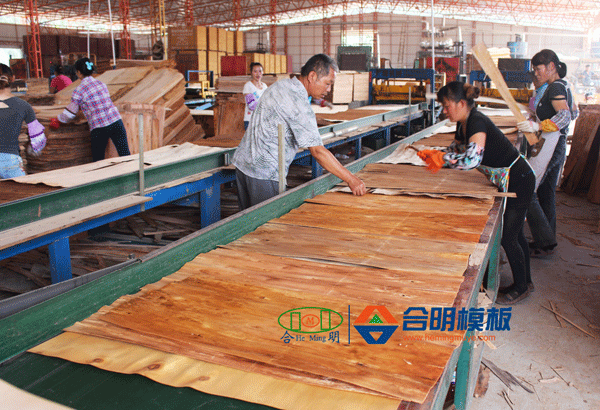 合明模板生產(chǎn)過程,包括滾膠-排板-冷壓-熱壓-鋸板-磨邊檢驗(yàn)-噴邊-噴制標(biāo)牌-打包十余道生產(chǎn)工序,每一道工序都按照嚴(yán)格標(biāo)準(zhǔn)進(jìn)行,車間主任、小組組長嚴(yán)格把控,質(zhì)量有保證。