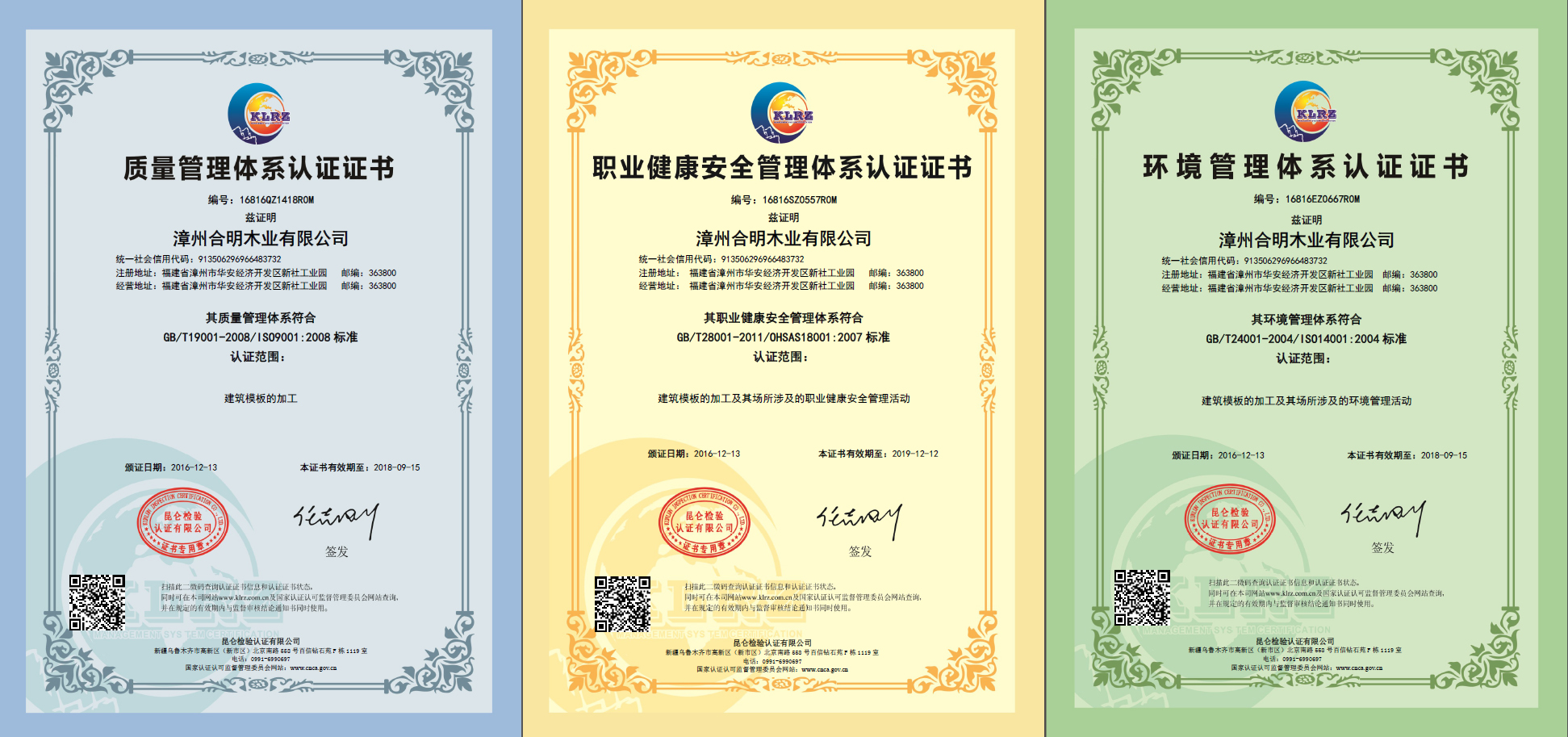 好消息!2016年12月,合明模板通過(guò)3大國(guó)際管理體系認(rèn)證!該認(rèn)證考核涉及到企業(yè)管理,產(chǎn)品生產(chǎn)、團(tuán)隊(duì)服務(wù)、環(huán)境衛(wèi)生、安全健康等各方面,合明模板經(jīng)過(guò)近一年的綜合考評(píng),順利通過(guò)測(cè)評(píng),得到了國(guó)際化標(biāo)準(zhǔn)認(rèn)證三大權(quán)威證書(shū)。