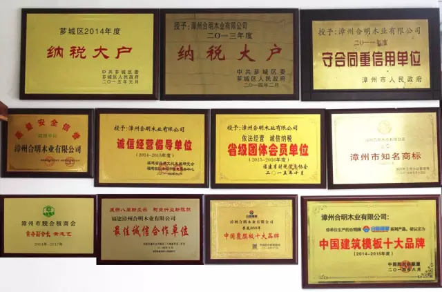 目前合明牌建筑模板已通過(guò)ISO9001質(zhì)量管理體系認(rèn)證等三大國(guó)際體系認(rèn)證,并獲得“中國(guó)知名品牌”、“福建省著名品牌”、“中國(guó)建筑模板十大品牌”、“中國(guó)覆膜板十大品牌”等榮譽(yù)稱號(hào)。合明木業(yè)規(guī)模宏大,管理規(guī)范,誠(chéng)信經(jīng)營(yíng),連續(xù)多年被認(rèn)定為“納稅大戶”,并被評(píng)為“依法經(jīng)營(yíng)誠(chéng)信納稅單位”、“誠(chéng)信經(jīng)營(yíng)倡導(dǎo)單位”、“質(zhì)量安全信譽(yù)單位”、“最佳誠(chéng)信合作單位”等。合明企業(yè)和產(chǎn)品受到廣大用戶及社會(huì)各界的大力認(rèn)可,充分說(shuō)明了合明良好的行業(yè)口碑及強(qiáng)大的企業(yè)實(shí)力。
