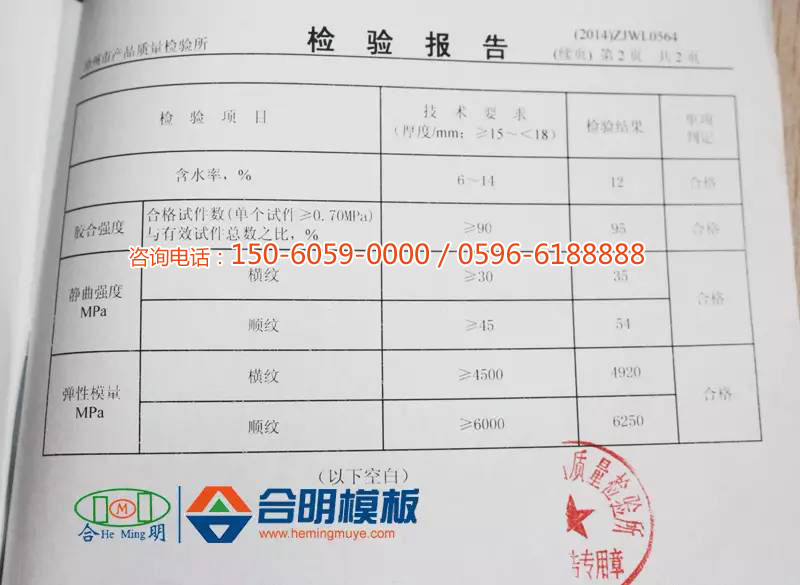 經(jīng)漳州市產(chǎn)品質(zhì)量檢驗所抽樣檢驗,合明模板含水率適中,在檢驗標(biāo)準(zhǔn)范圍內(nèi),膠合強度、靜曲強度、彈性模量等檢驗數(shù)值均在標(biāo)準(zhǔn)之上,合明模板產(chǎn)品質(zhì)量在合格模板產(chǎn)品標(biāo)準(zhǔn)之上。