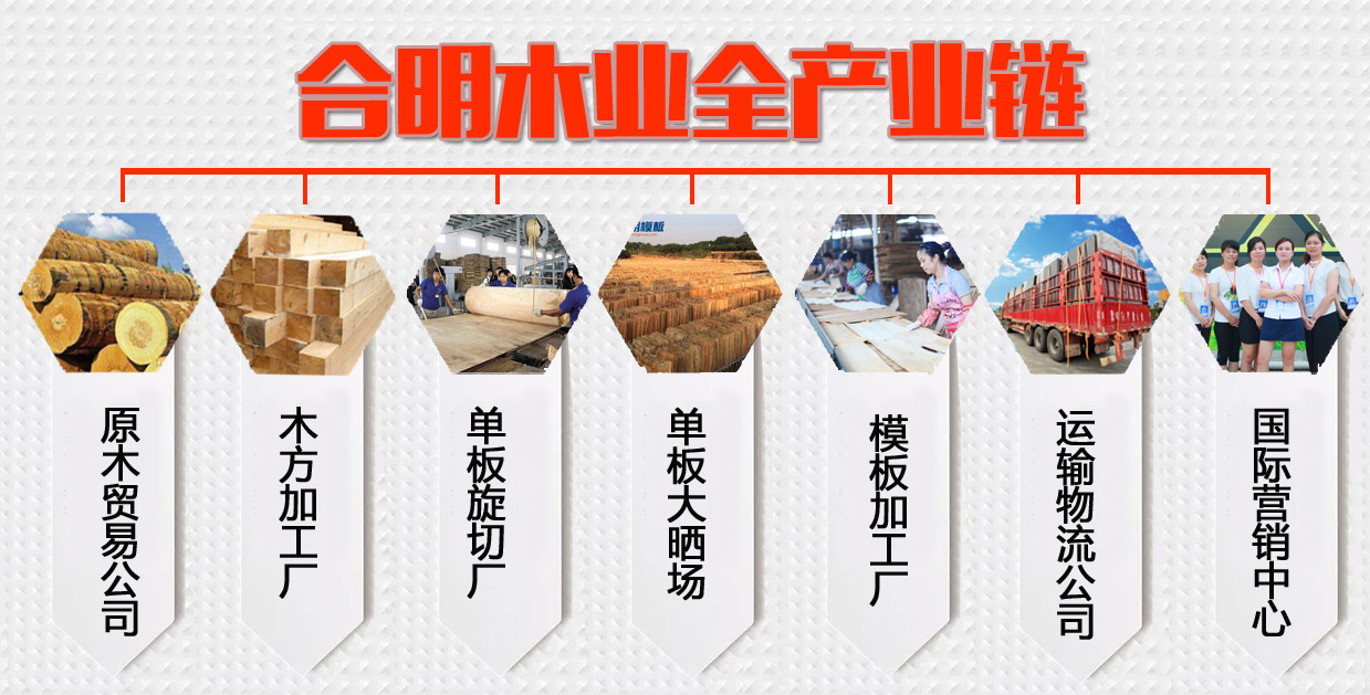 合明木業(yè)集產供銷為一體,除了模板生產外,旗下還有營銷中心、國際事業(yè)部、物流園、原木貿易公司、原木旋切廠、曬板場、方木加工廠等建筑模板生產附屬機構,踏實穩(wěn)步經營,形成從原材料采購到建筑模板、建筑方木生產、出售全產業(yè)鏈大型企業(yè)。