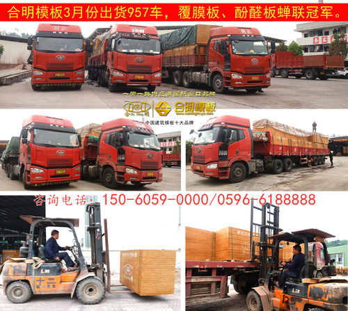 3月份,合明模板出貨量大大增加,創(chuàng)歷史新高:建筑模板發(fā)貨957車,建筑木方發(fā)貨303車,出口建筑模板102個貨柜,總計1362車,比去年3月份增長45%。