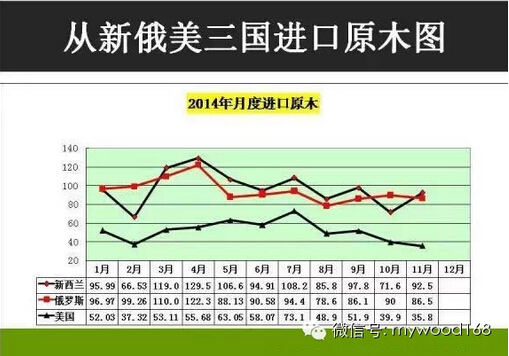 我國進(jìn)口原木的三大來源國為新西蘭、俄羅斯和美國。2014年這些原木的進(jìn)口量如何,他們的逐月進(jìn)口走勢圖和對比誰強誰弱?
