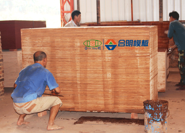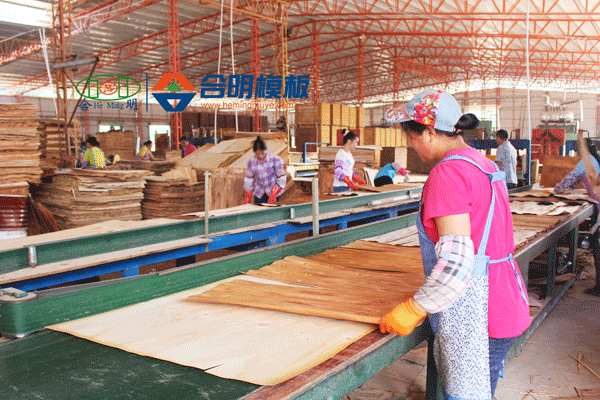 3、烘干或者曬成濕度適宜的單板。合明模板要求所有的單板濕度控制在12度-14度之間,這個濕度最能使膠板充分融合,增強模板膠合強度,提高模板周轉(zhuǎn)次數(shù)。