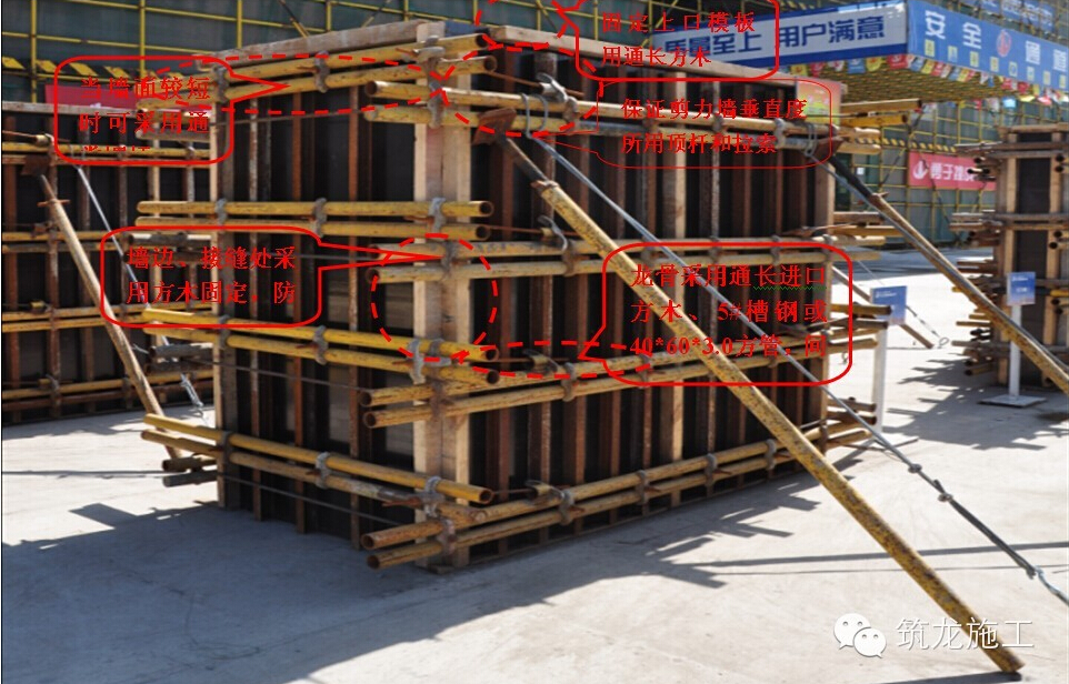 2.1剪力墻龍骨應(yīng)采用通長(zhǎng)50*90進(jìn)口方木、5#槽鋼或40*60*3,0方管加固,凈空間距不得大于200mm;所有模板拼縫處均應(yīng)設(shè)置和槽鋼或方管同規(guī)格進(jìn)口方木加固,防止漏漿。2.2所有剪力墻應(yīng)設(shè)置保證墻體垂直度的斜撐,防止在澆混凝土過程中產(chǎn)生墻體偏扭。