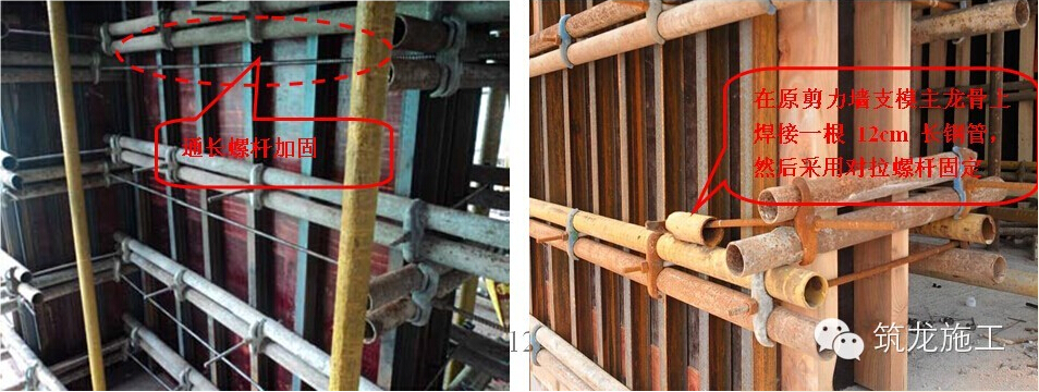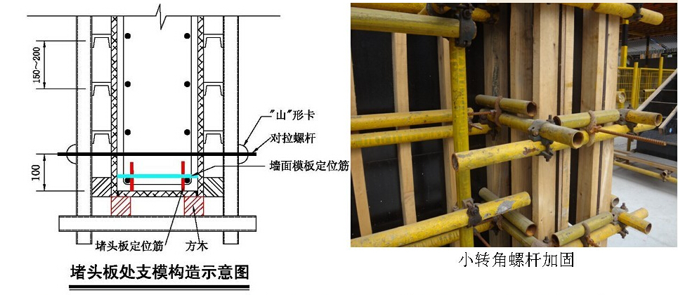 4.5剪力墻陰角加固:剪力墻陰角處必須采用兩道穿墻螺桿加固,長(zhǎng)方向陰角處穿墻螺桿應(yīng)加長(zhǎng)加固短方向端頭板。